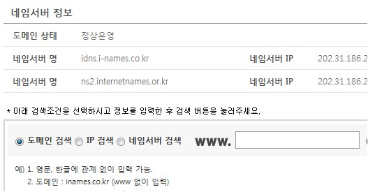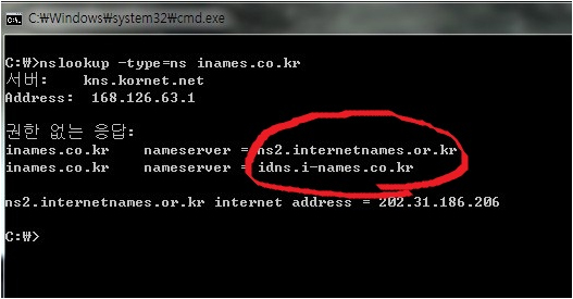 [ÇöÀç ÀÌ¿ë ÁßÀÎ ³×ÀÓ¼¹ö È®Àιæ¹ý] 1) °í°´´Ô PC¿¡¼ "À©µµ¿ìŰ + R" À» ´·¯ "½ÇÇà"âÀÌ ³ª¿À¸é "cmd" ¸¦ Ä¡°í ¿£ÅÍ ¸¦ Ŭ¸¯ÇÕ´Ï´Ù. 2) ¾Æ·¡¿Í °°Àº âÀÌ ¶ß°Ô µÇ¸é "nslookup -type=ns ÀÚ½ÅÀÇ µµ¸ÞÀÎ" À» ¾Æ·¡¿Í °°ÀÌ ½áÁÖ°í ¿£Å͸¦ Ĩ´Ï´Ù. 3) À§ »¡°£ ¿ø¾È¿¡ ÀÖ´Â 2°³ÀÇ µµ¸ÞÀÎÀÌ 1,2Â÷ ³×ÀÓ¼¹öÀÇ Á¤º¸ÀÔ´Ï´Ù. 4) À¥¿¡¼ ã´Â ¹æ¹ýÀº À¥ºê¶ó¿ìÁ®¿¡¼ ""http://www.inames.co.kr"" ¿¡ Á¢¼ÓÇϽŠÈÄ Áß°£¿¡ ÀÖ´Â ¾Æ·¡ µµ¸ÞÀÎ ³Ö´Â ºÎºÐ¿¡
